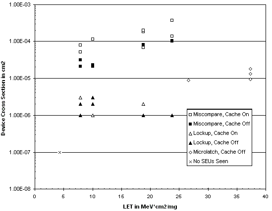 SEU results were fairly similar to previous 80486 testing. Threshold for both miscompare and lockup SEUs was between 4.29 - 7.88 both with and without cache. Figure 1 shows SEU data.