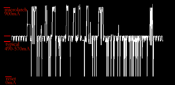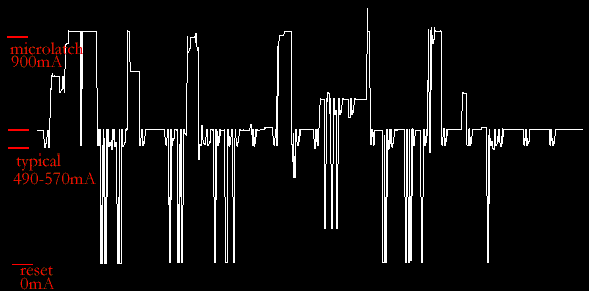 Although none of these devices displayed typical SEL (up to a maximum tested LET of 37.3), unlike previous 80486 testing, all three did experience destructive conditions. Figures 2, 3, and 4 display DUT current consumption over the course of a test run, with samples taken ~ every 4 msec. Please note that at no time did the current reach the SEL limit of 1.2A. Figure 2 shows a typical test run where no microlatch was observed, for reference. The two spikes down to 0mA are board resets triggered by SEUs, and the typical current range is ~ 490-570mA. Figure 3 shows a test run where 9 microlatches occurred; the device was still functional following this test run; however, it failed following a microlatch on the next run. Figure 4 shows a test run where 6 microlatches occurred. The device was nonfunctional following the test run: it would lock up shortly after attempting to begin normal operations. Both of these test runs were at LET 37.3; a third device experienced a destructive event during its first run, at LET 26.6.