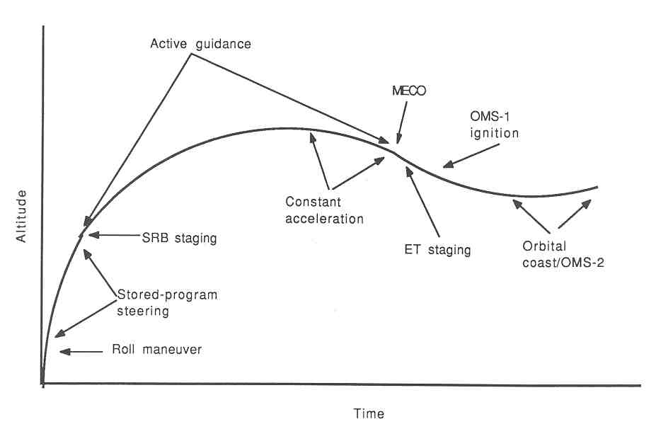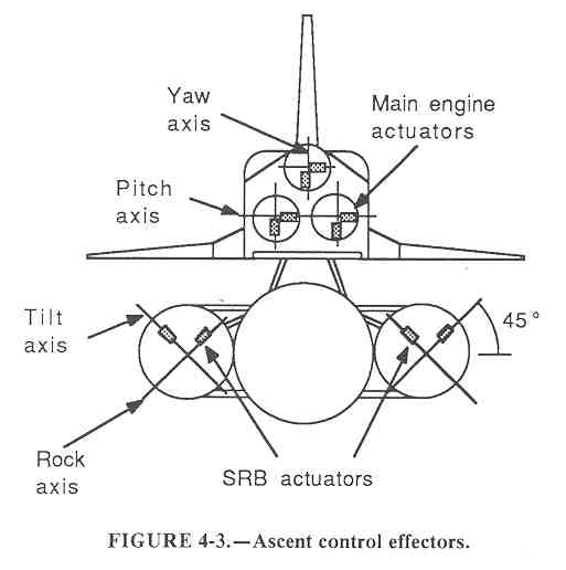 The Space Shuttle ascent configuration and the control effectors used are shown in figure 4-3. A profile of the ascent trajectory is contained in figure 4-4. All Space Shuttle ascent events and dynamic guidance and control are provided by the Orbiter avionics flight software. Between lift-off and SRB staging, the vehicle is guided by stored roll, yaw, and pitch profiles, which adapt for performance variations caused by SRB temperature changes. Thrust vector control is performed using the three main engines on the Orbiter and the two SRB engines. During the maximum dynamic pressure region, the SRB thrust is programmed by propellant shaping to decrease temporarily, and the SSME's are throttled as necessary to prevent exceedance of the 3g structural limit. The elevons also are adjusted as required to relieve aerodynamic structural loads on the Orbiter. After SRB separation, a powered explicit guidance algorithm is invoked by which the vehicle is guided to the desired trajectory conditions at main engine cutoff (MECO). The reaction control system (RCS) thrusters are used to control. the vehicle after MECO. Separation from the ET is followed by performance of one or two orbital maneuvering system (OMS) translation maneuvers, as required, to achieve the final orbit. Abort capabilities exist throughout the ascent phase covering contingencies such as loss of main engines. Depending on the time of occurrence, the abort may require a return to the launch site, a diversion to a landing in Europe or Africa, a one-orbit diversion to a landing at Edwards Air Force Base or White Sands, or an abort to orbit. In addition to the guidance, navigation, and control (GN&C) functions described previously, the system performs a number of critical ascent vehicle management and sequencing services including
