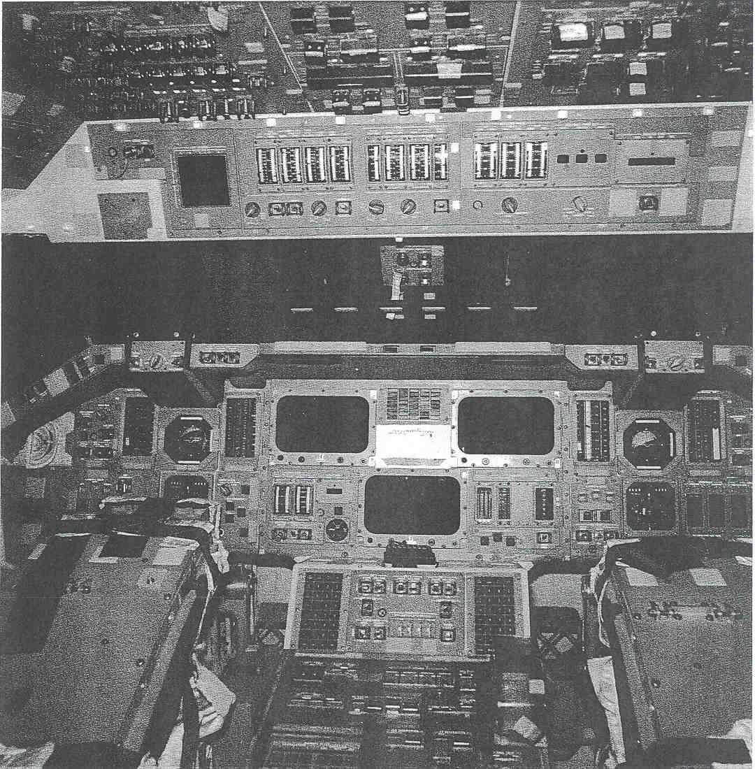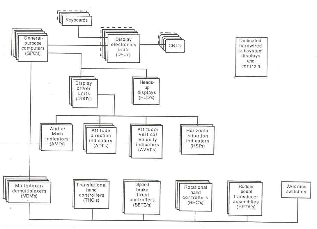 The display and control (D&C) subsystem includes the crew interface devices located at the commander and pilot forward stations and the mission and payload specialist stations in the aft part of the flight deck. Figures 4-21 and 4-22 are photographs of the forward and aft flight decks, respectively, showing the locations of the various devices. Figure 4-23 contains a simplified block diagram of the D&C system. (See also the avionics system block diagram [A, I] through [D,7].) Included are the multifunctional CRT display system (MCDS), the dedicated flight control displays driven by the display driver units, the heads-up displays, the various pilot input devices, and dedicated, hardwired subsystem displays and controls. All, except for the dedicated, hardwired devices, receive data from, and execute commands through, the central computer complex.