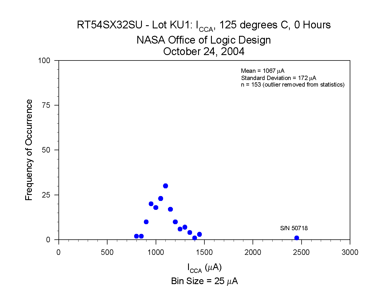 Figure 1. "Out of family" but in specification ICCA value.Examining Figure 1, we see an ICCA value for S/N 50718 of less than 2.5 mA at +125 ºC, far below the specification value of 25 mA total. The other contributor to leakage current, ICCI, was less then 4 mA.