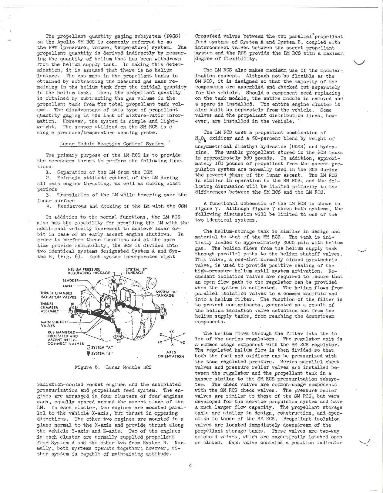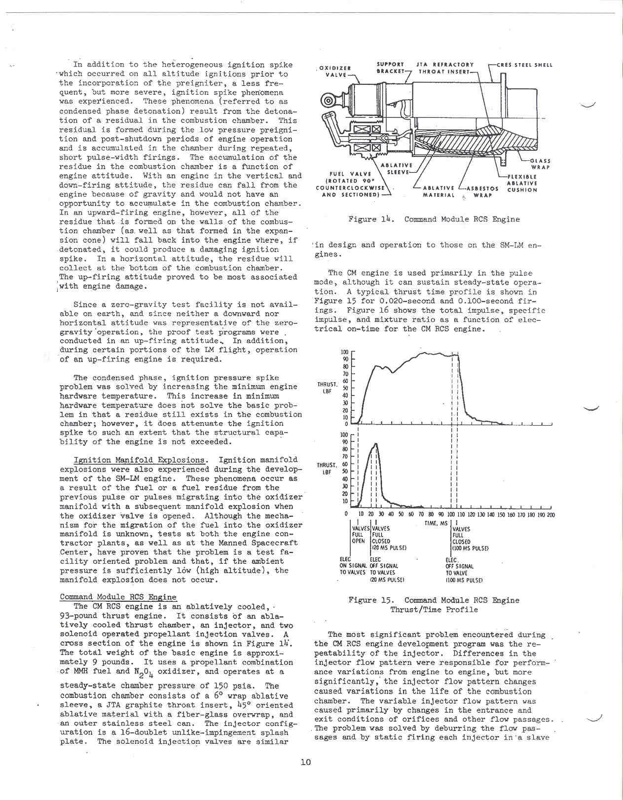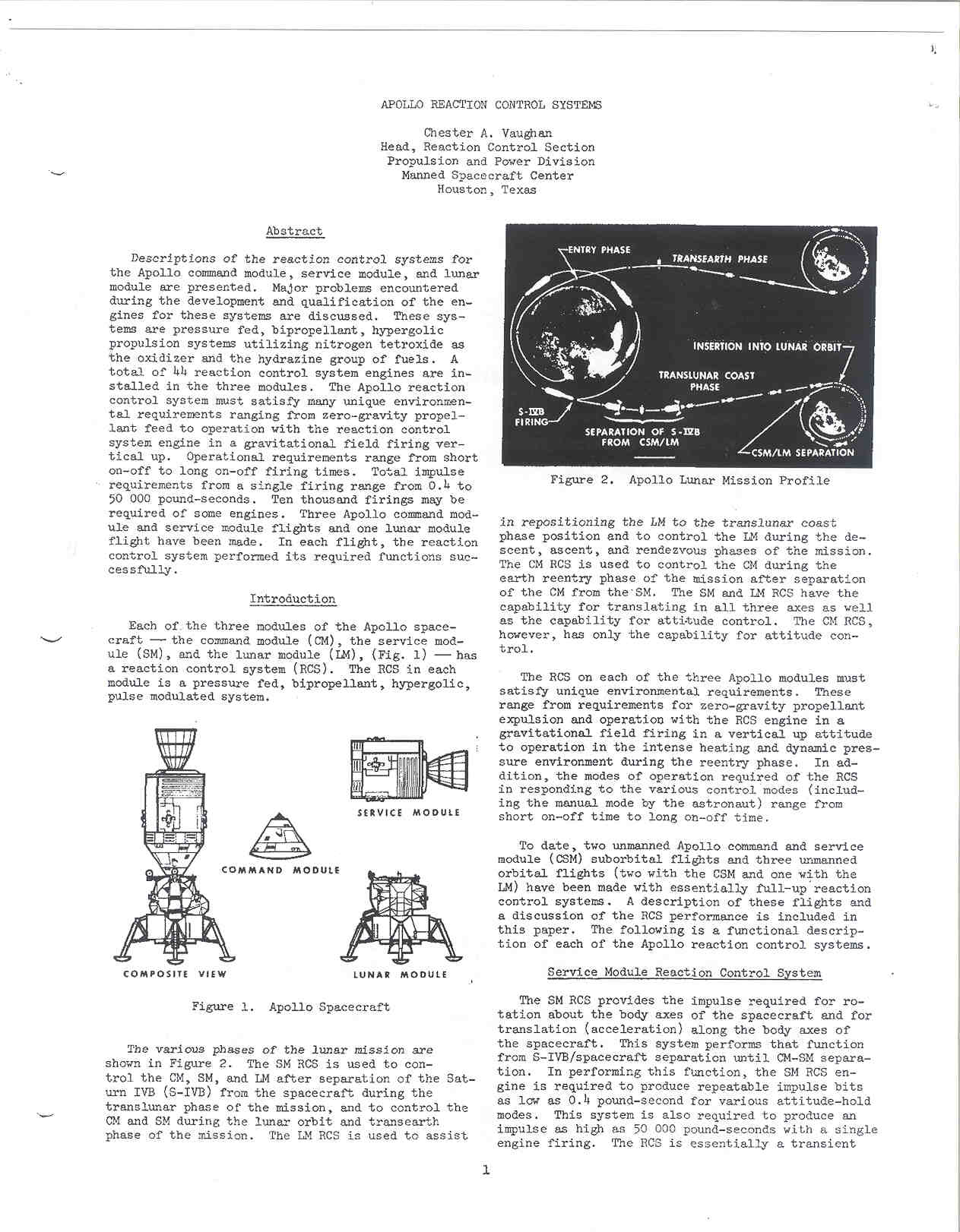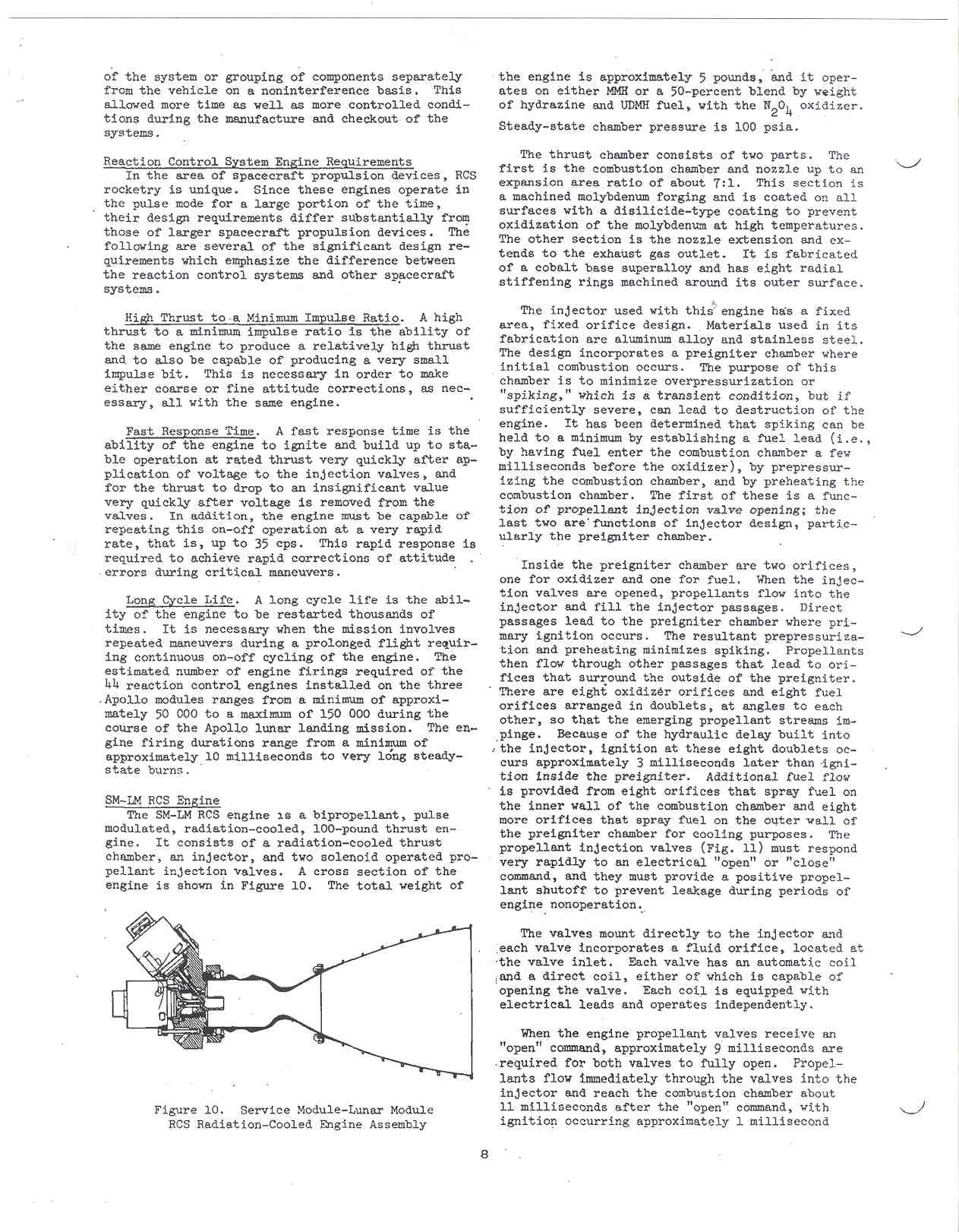 Descriptions of the reaction control systems for the Apollo command module, service module, and lunar module are presented. Major problems encountered during the development and qualification of the engines for these systems are discussed. These systems are pressure fed, bipropellant, hypergolic propulsion systems utilizing nitrogen tetroxide as the oxidizer and the hydrazine group of fuels. A total of 44 reaction control system engines are installed in the three modules. The Apollo reaction control system must satisfy many unique environmental requirements ranging from zero-gravity propellant feed to operation with the reaction control system engine in a gravitational field firing vertical up. Operational requirements range from short on-off to long on-off firing times. Total impulse requirements from a single firing range from 0.4 to 50 000 pound-seconds. Ten thousand firings may be required of some engines. Three Apollo command module and service module flights and one lunar module flight have been made. In each flight, the reaction control system performed its required functions successfully.