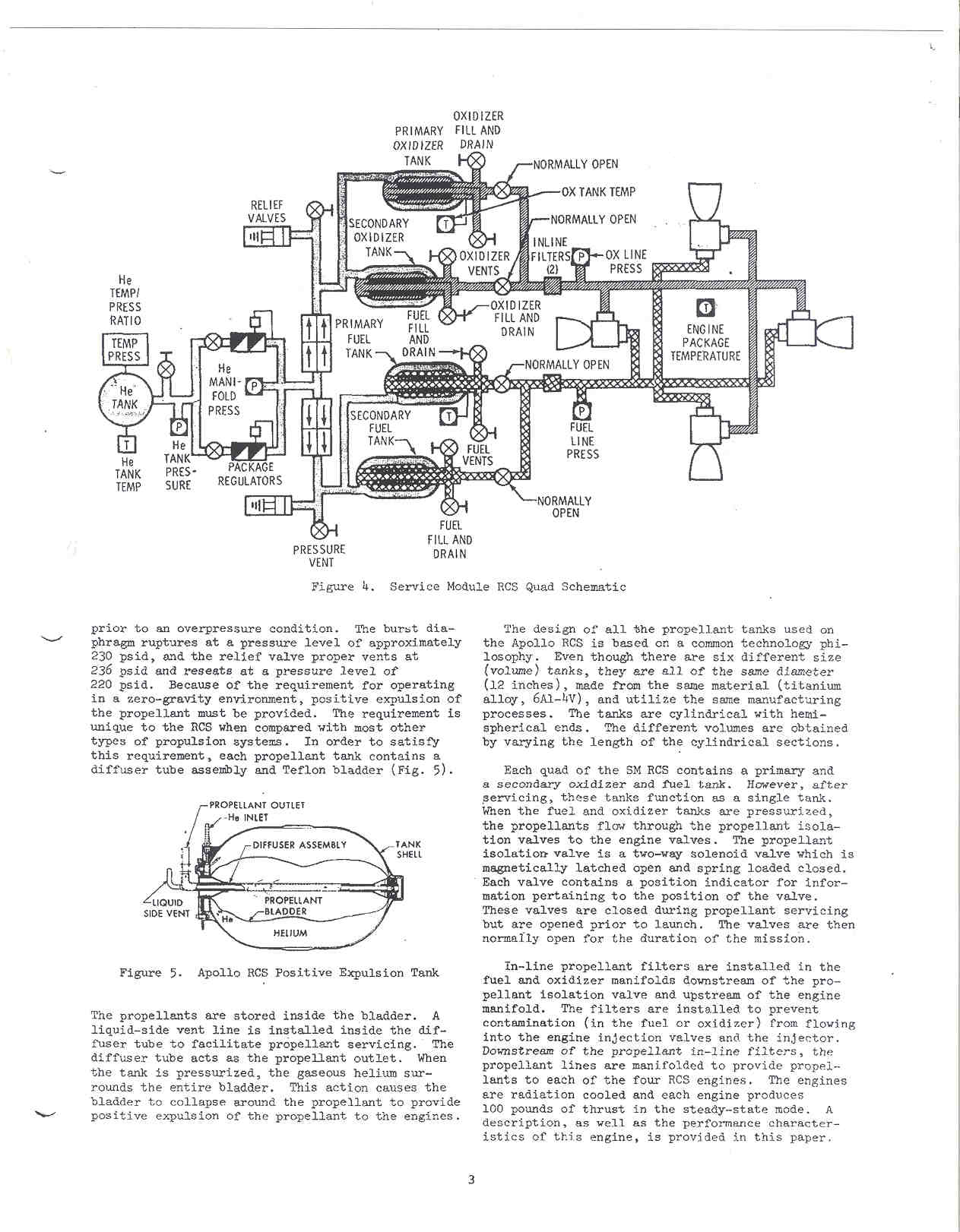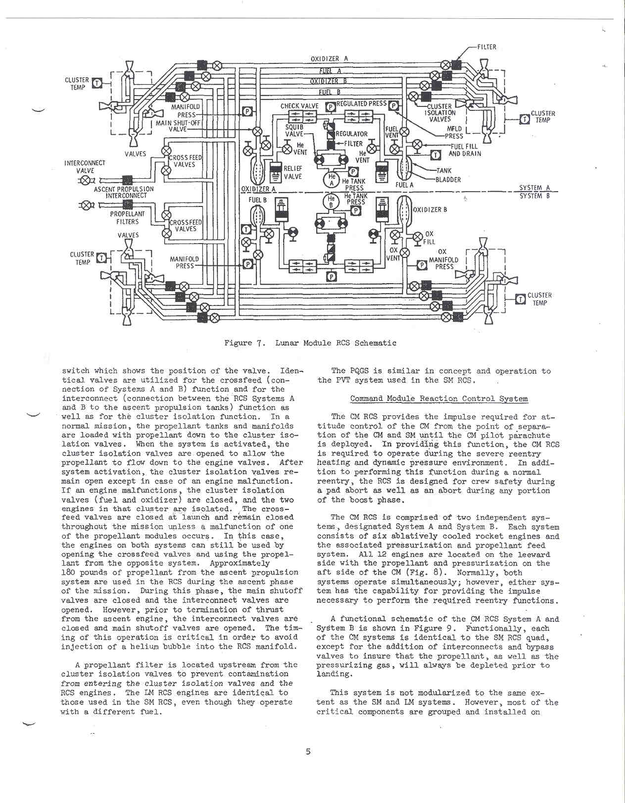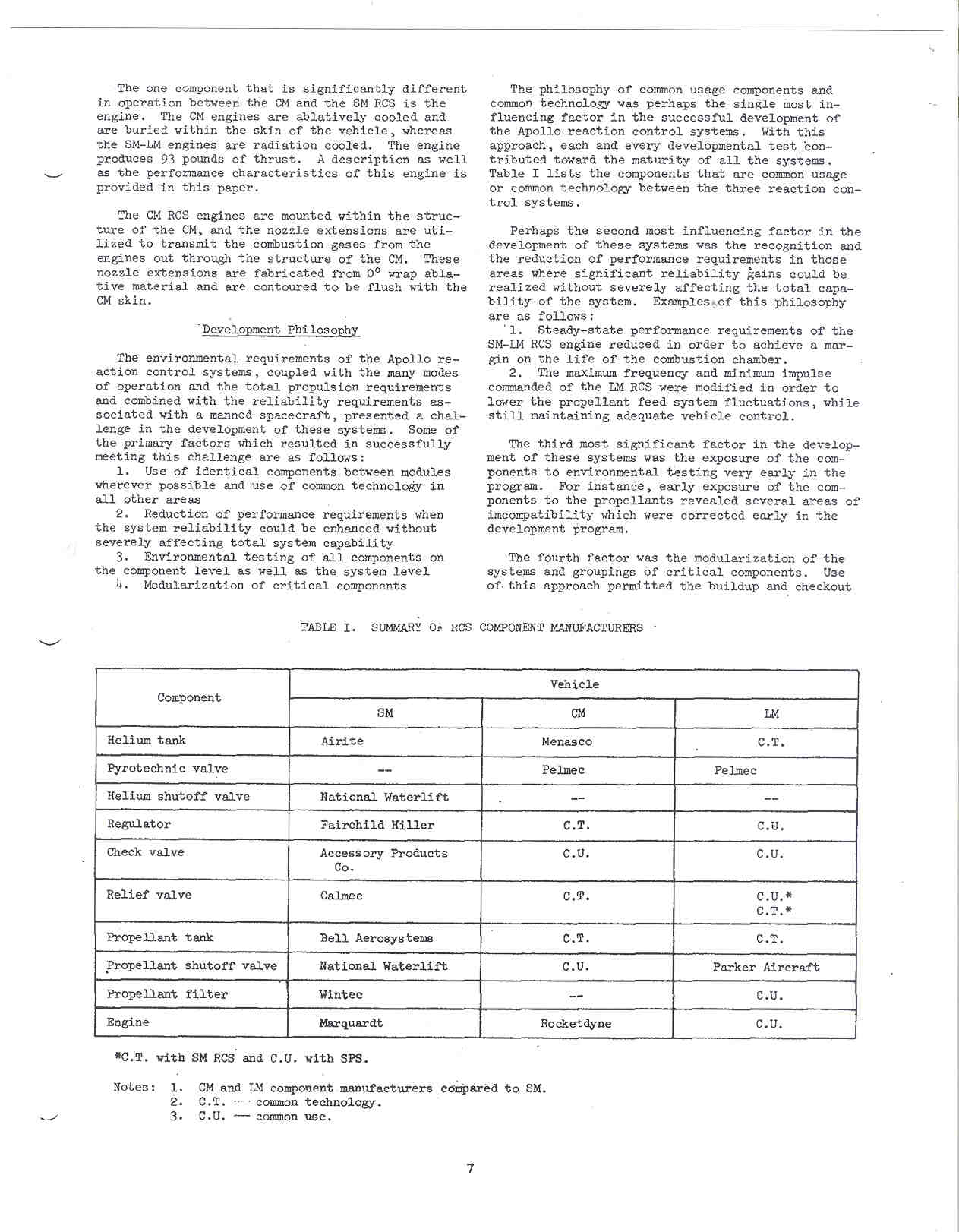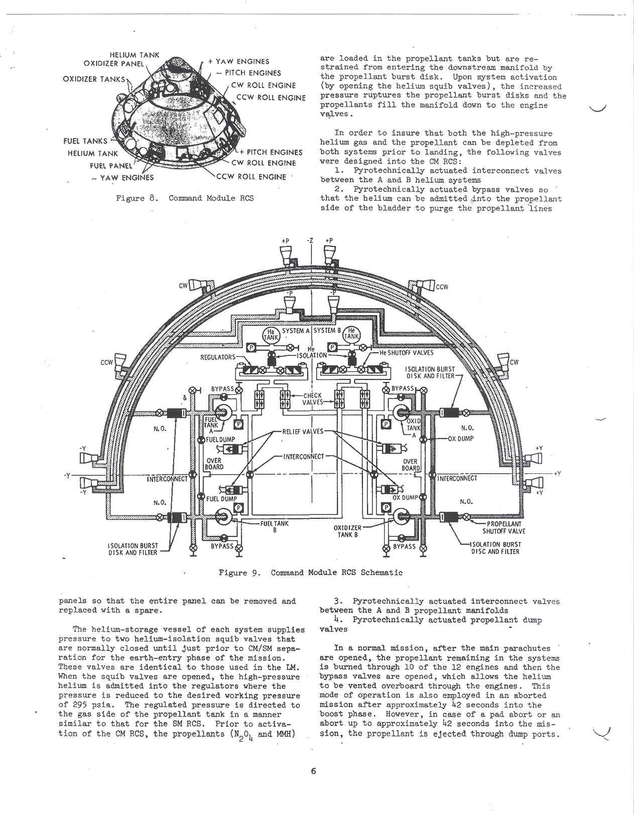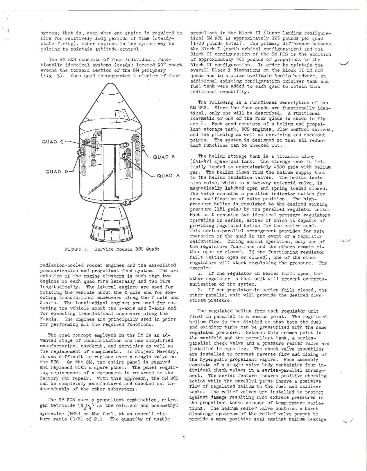 Descriptions of the reaction control systems for the Apollo command module, service module, and lunar module are presented. Major problems encountered during the development and qualification of the engines for these systems are discussed. These systems are pressure fed, bipropellant, hypergolic propulsion systems utilizing nitrogen tetroxide as the oxidizer and the hydrazine group of fuels. A total of 44 reaction control system engines are installed in the three modules. The Apollo reaction control system must satisfy many unique environmental requirements ranging from zero-gravity propellant feed to operation with the reaction control system engine in a gravitational field firing vertical up. Operational requirements range from short on-off to long on-off firing times. Total impulse requirements from a single firing range from 0.4 to 50 000 pound-seconds. Ten thousand firings may be required of some engines. Three Apollo command module and service module flights and one lunar module flight have been made. In each flight, the reaction control system performed its required functions successfully.