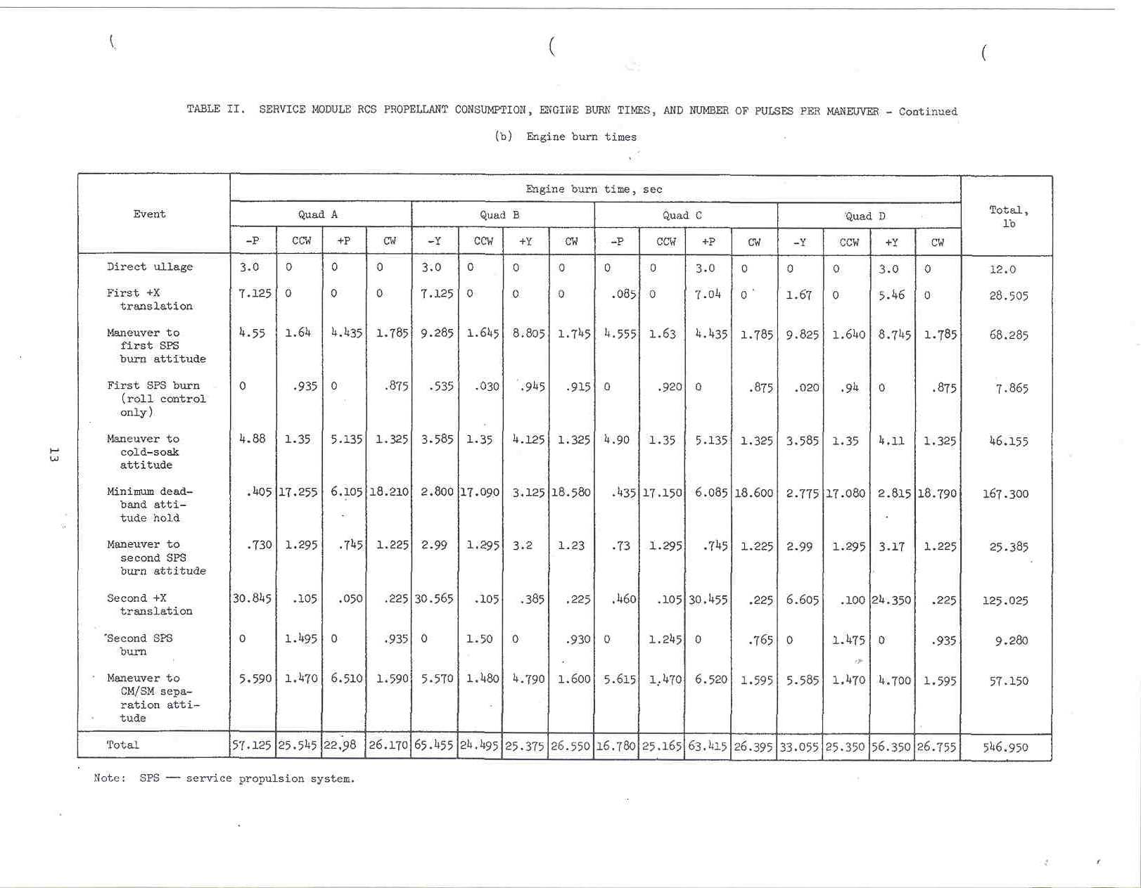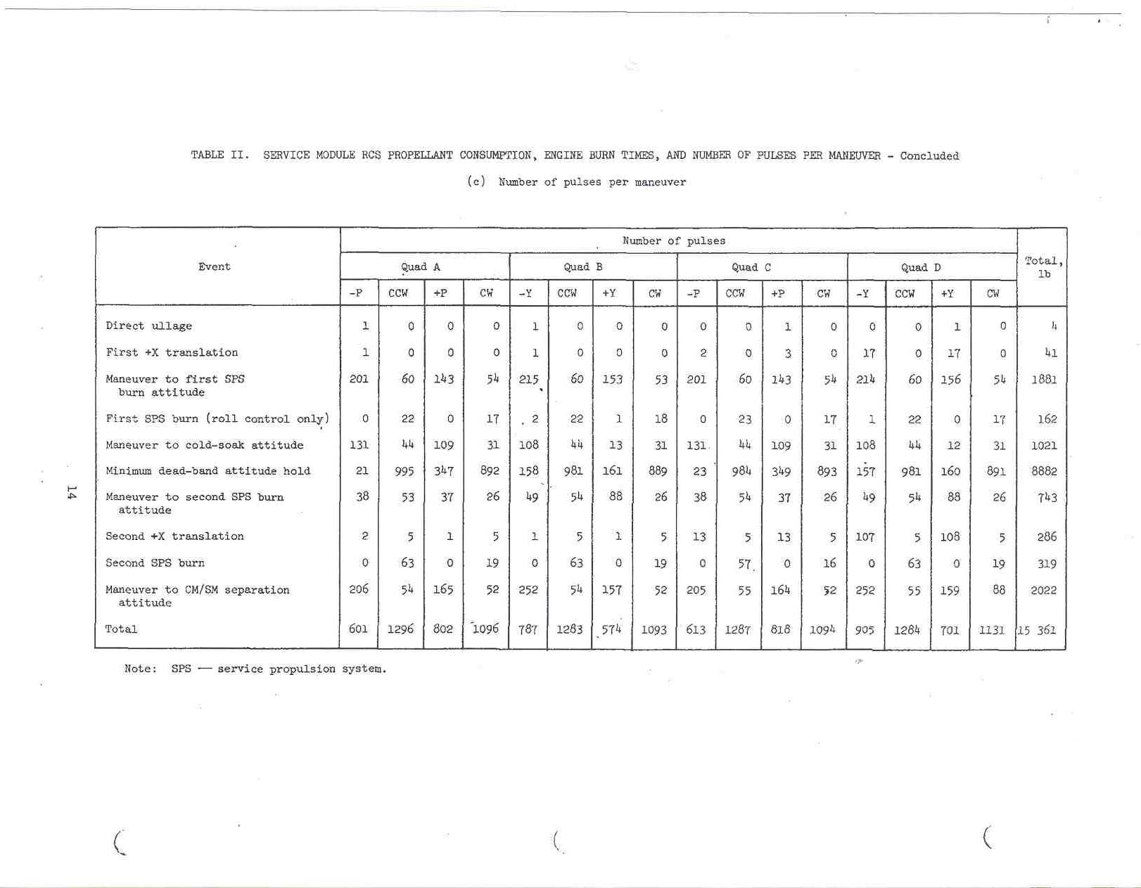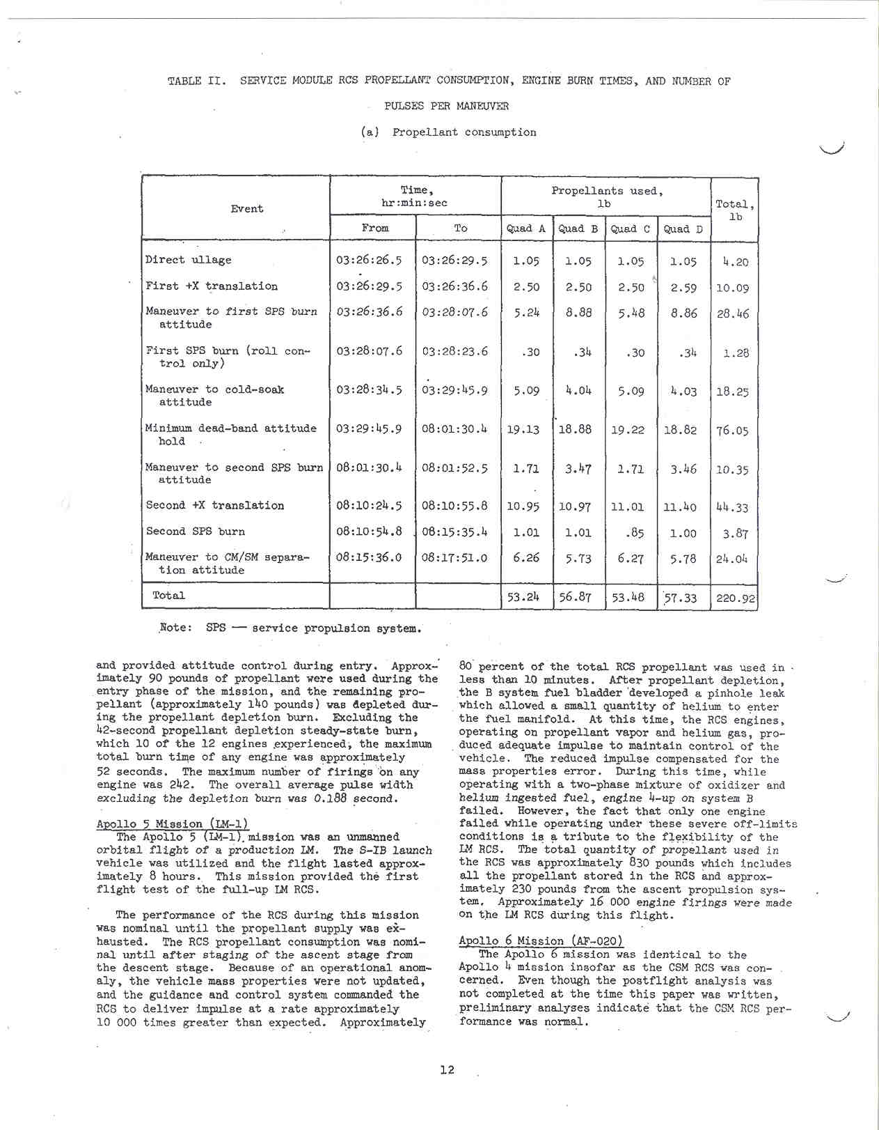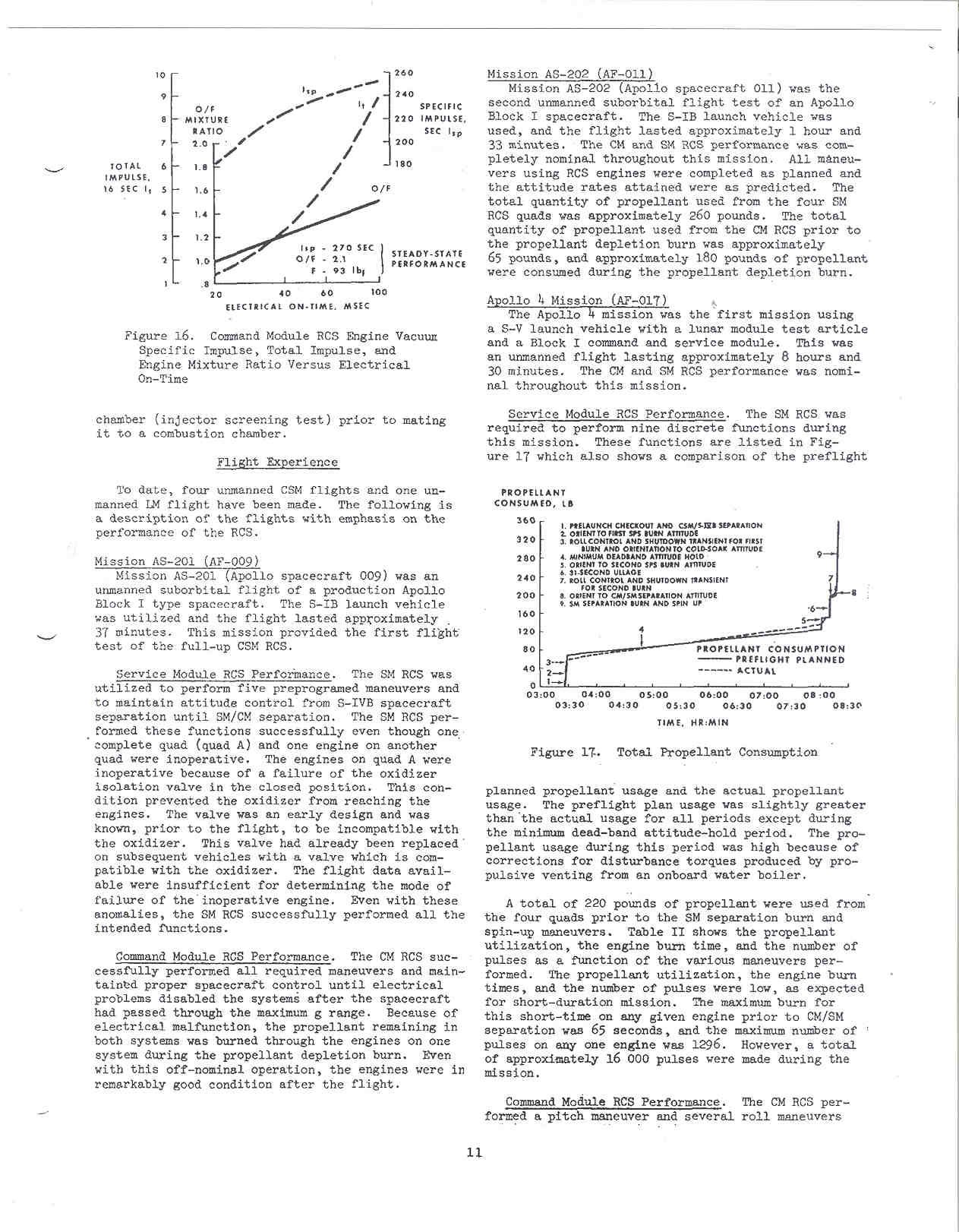 Descriptions of the reaction control systems for the Apollo command module, service module, and lunar module are presented. Major problems encountered during the development and qualification of the engines for these systems are discussed. These systems are pressure fed, bipropellant, hypergolic propulsion systems utilizing nitrogen tetroxide as the oxidizer and the hydrazine group of fuels. A total of 44 reaction control system engines are installed in the three modules. The Apollo reaction control system must satisfy many unique environmental requirements ranging from zero-gravity propellant feed to operation with the reaction control system engine in a gravitational field firing vertical up. Operational requirements range from short on-off to long on-off firing times. Total impulse requirements from a single firing range from 0.4 to 50 000 pound-seconds. Ten thousand firings may be required of some engines. Three Apollo command module and service module flights and one lunar module flight have been made. In each flight, the reaction control system performed its required functions successfully.