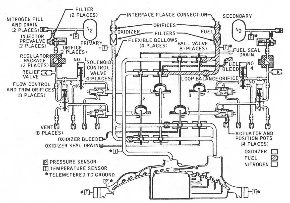 Apollo gains a measure of simplicity from features simple both in design and operation, complex in design but simple to operate, or simple by being passive in function. The concept of simple design and simple operation is best illustrated by the Apollo rocket-propulsion systems (fig. 2-2). The pressure feeding and redundant valving guarantee the arrival of the propellant in the combustion chamber, where hypergolic reaction assures ignition. Ablative materials for chamber walls assure chamber integrity while simplifying design greatly.