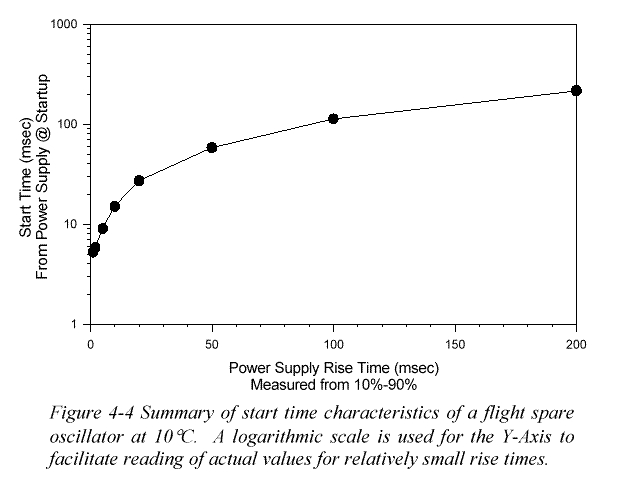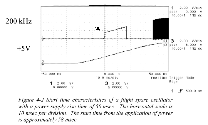 Start times of oscillators may be a function of power supply rise time and may not start up clean. Example with a 50 ms power supply rise time. For the same oscillator, this is a summary of performance over a range of rise times.