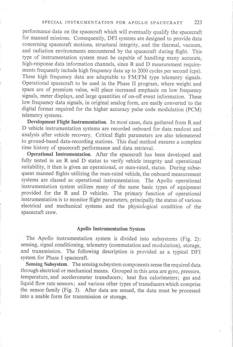 The recent advent of space exploration and manned space flight has provided aerospace technologists and engineers with many challenging problems in instrumentation development and application Capabilities for accurate determination of inflight spacecraft performance and external environmental parameters have steadily increased from early missile flights, which required only a few relatively simple measurements, to present-day programs such as Apollo, which require in excess of several hundred independent and individual measurements.